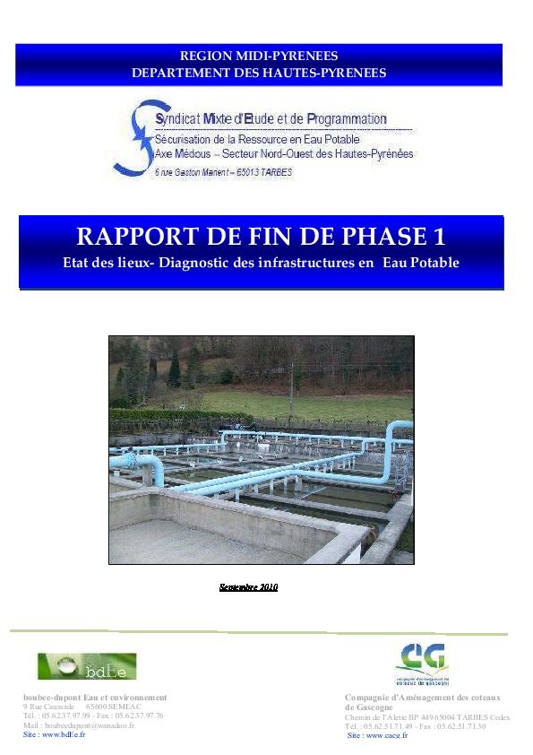 Sécurisation de la ressource en eau potable - Axe Médous - Secteur Nord-Ouest des Hautes-Pyrénées - Rapport de fin de phase 1 (Etat des lieux, Diagnostics des infrastructures en eau potable)