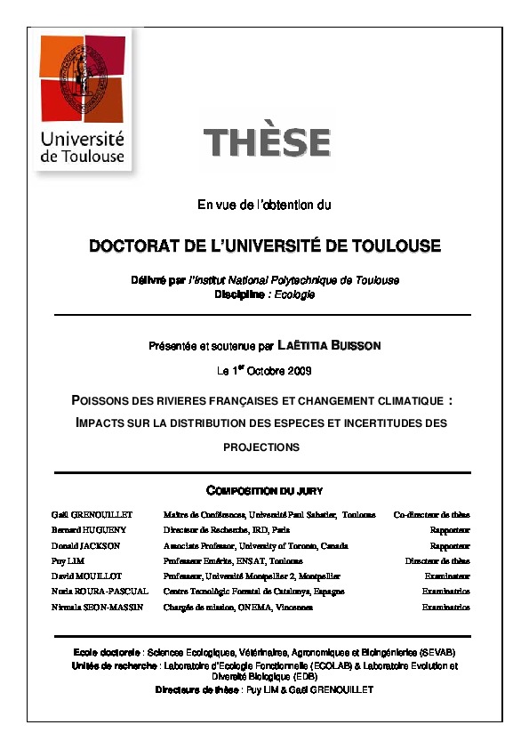 Déterminants environnementaux de la distribution spatiale des espèces de poisson de rivière/ Modélisation des patrons actuels et futurs de distribution : incertitudes et approches d'ensembles/ Evaluation des impacts potentiels du changement climatique sur les poissons des rivières françaises