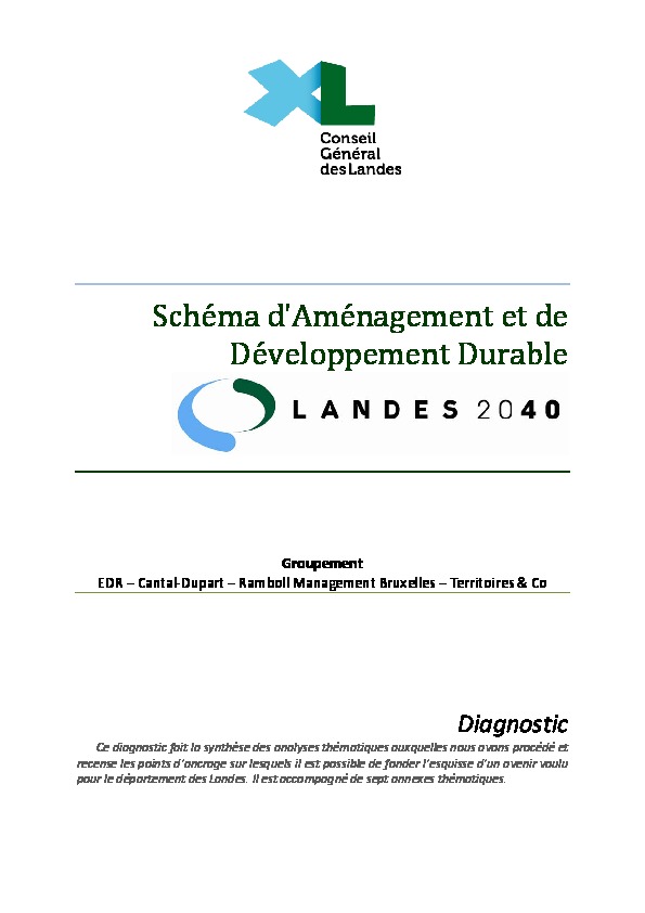Ce diagnostic fait la synthèse des analyses thématiques tréalisées et recense les points d'ancrage sur lesquels il est possible de fonder l'esquisse d'un avenir voulu pour le département des Landes.