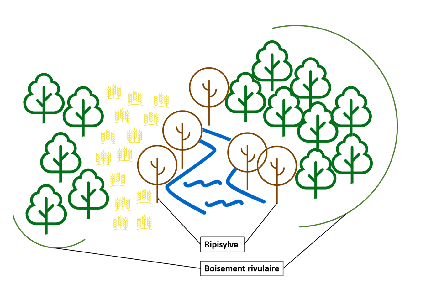- la ripisylve, qui correspond à la première ligne d'arbre se développant sur les berges des cours d'eau ;