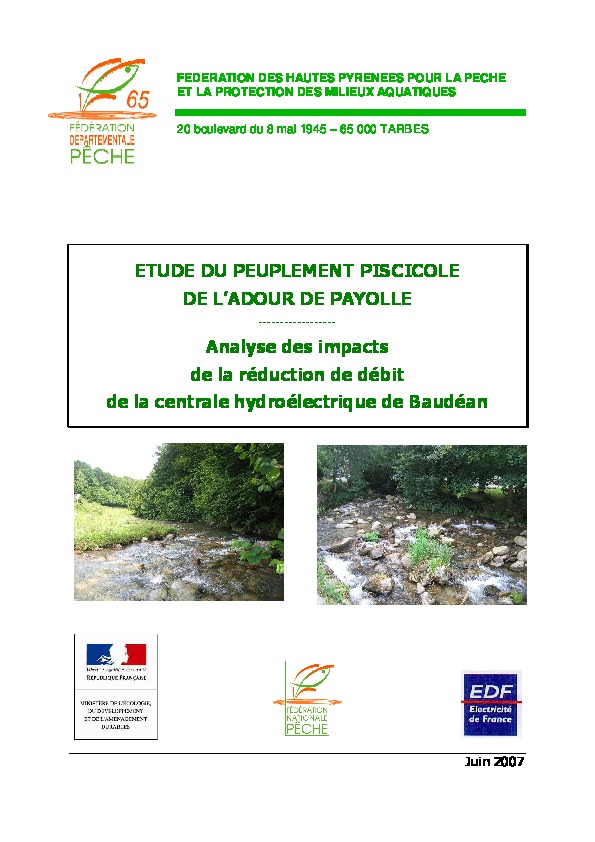 Etude du peuplement piscicole de l'ADOUR à PAYOLLE. Analyse des impacts de la réduction de débit de la centrale hydroélectrique de BEAUDEAN.