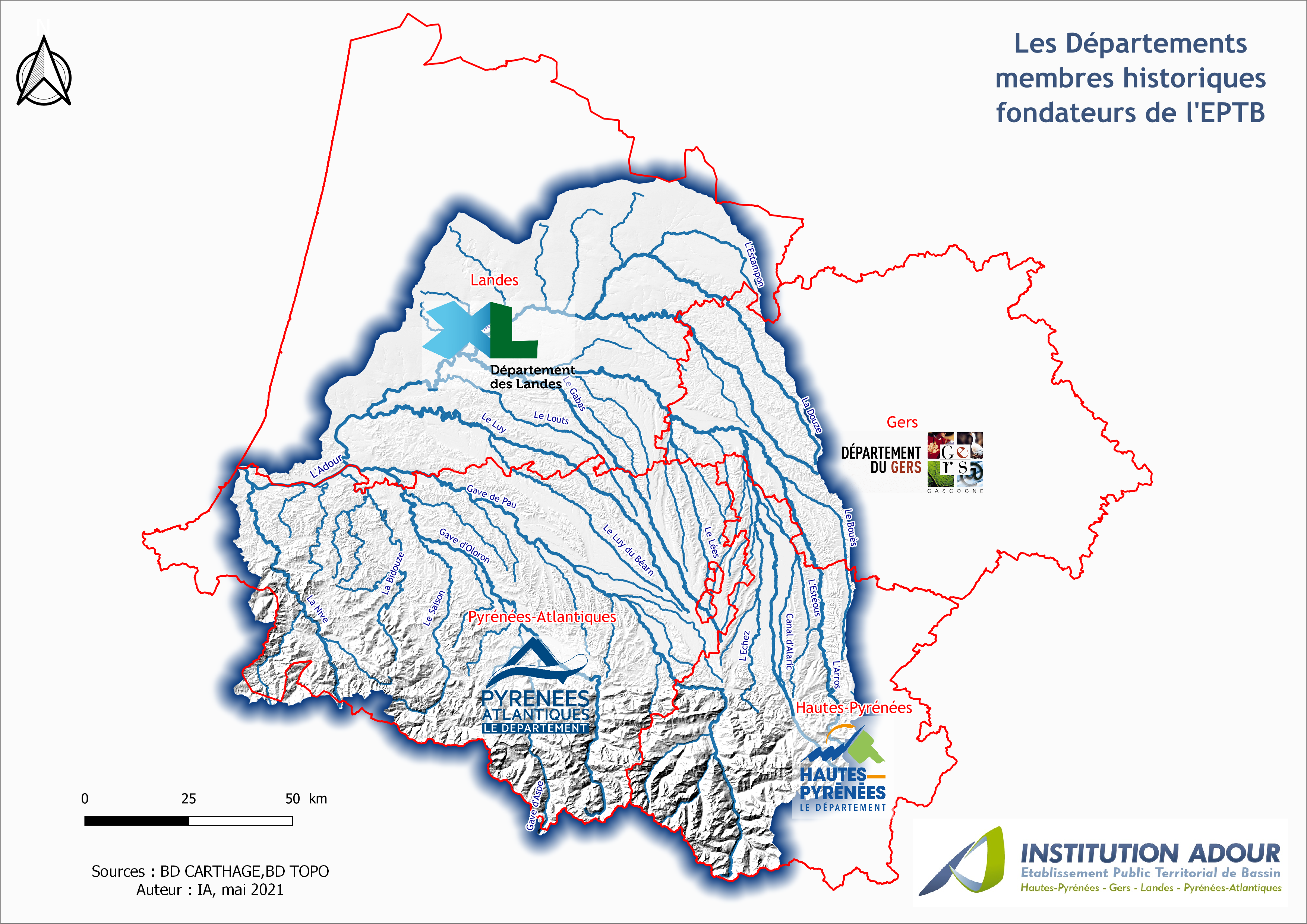 Les quatre Départements du bassin de l'Adour (Hautes-Pyrénées, Gers, Landes et Pyrénées-Atlantiques) sont les membres fondateurs de l'Institution Adour.