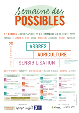 Face aux enjeux climatiques, sociaux, économiques que notre civilisation traverse, se rencontrer, échanger, découvrir, expérimenter, imaginer, nous semblent très précieux. C'est à l'occasion de cette première édition de la Semaine des Possibles dans le Gers que nous vous proposons de partager des moments forts avec des auteurs, des acteurs de terrain, des réalisateurs, des experts, des intervenants sur les champs de l'écologie, de la nature, ... Ils viendront partager leurs compréhensions des enjeux et des pistes de réflexion pour œuvrer ensemble à un monde plus durable et plus vivable.