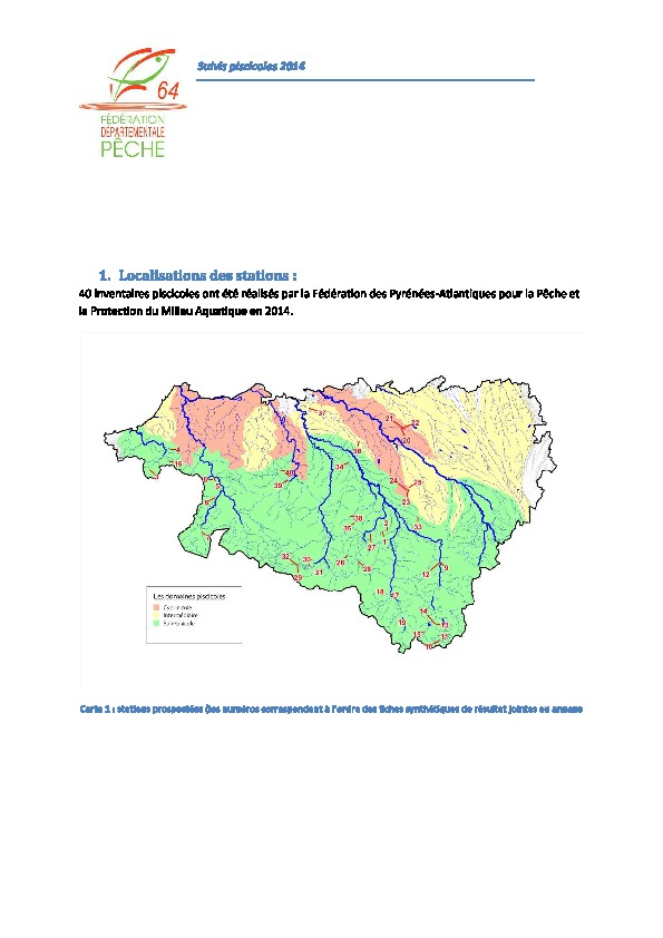 Bilan des 40 inventaires piscicoles effectués en 2014 dans les Pyrénées Atlantiques. 57% des stations présentent de "bonnes" qualités piscicoles. Les stations de montagnes sont sous-évaluées, car elles sanctionnent le peuplement monospécifique, naturellement peuplé de Truites communes. Cependant, pour les 39 stations en 1ère catégorie, la qualité piscicole est toute autre, avec 20% de très mauvaise qualité et 26% de mauvaise qualité.