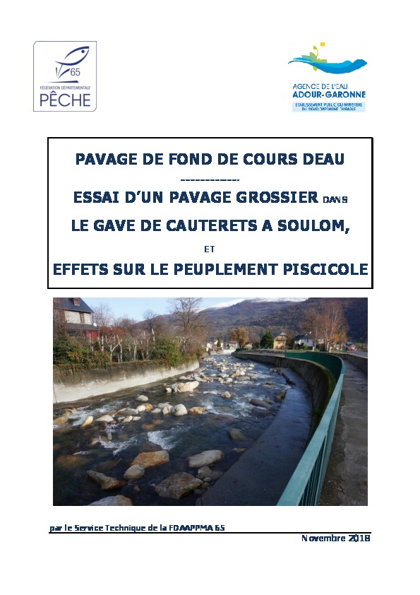 De nombreux pavages de fond ont été réalisés suite aux crues de juin 2013. Visant à uniformiser le fond et supprimer toute hétérogénéîté, ils n'offrent aucun abri hydraulique pour les biocénoses. A la demande de l'ONEMA et de la FDAAPPMA65, un de ces pavages a été réalisé pour concilier les impératifs de protection contre les crues et la préservation d'un minimum d'habitat en maintenant de la rugosité. En 2017 (2 ans après les aménagements) un inventaire piscicole a été réalisé pour évaluer le bénéfice éventuel de ces réalisations.