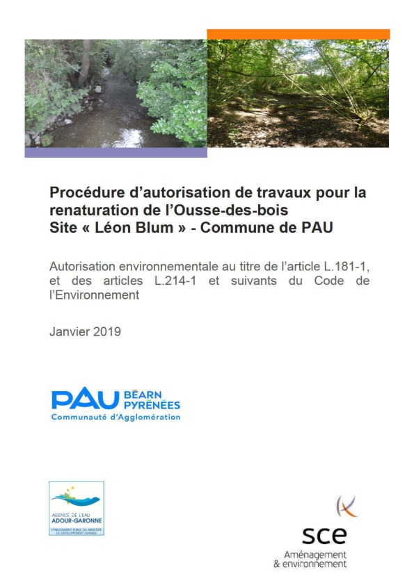 L'étude présente l'un des projets retenus par la CA Pau-Béarn-Pyrénées portant sur la restauration du lit de l’Ousse-des-bois sur 540m en amont de l’avenue Léon Blum, par un reméandrage du lit sur son tracé historique. Le projet s'appuie sur 3 objectifs principaux : - Restaurer son champ d'expansion - Restaurer l'hydromorphologie du cours d'eau - Améliorer sa qualité hydromorphologique, Elle débouche sur une demande d’autorisation environnementale pour les travaux de reméandrage sur le linéaire retenu.