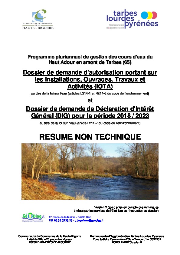 PPG des cours d'eau du Haut Adour en amont de Tarbes (65). Dossier de demande d'autorisation portant sur les Installations, Ouvrages, Travaux et Activités 'IOTA) et demande de DIG pour la période 2018-2023 - Résumé non technique