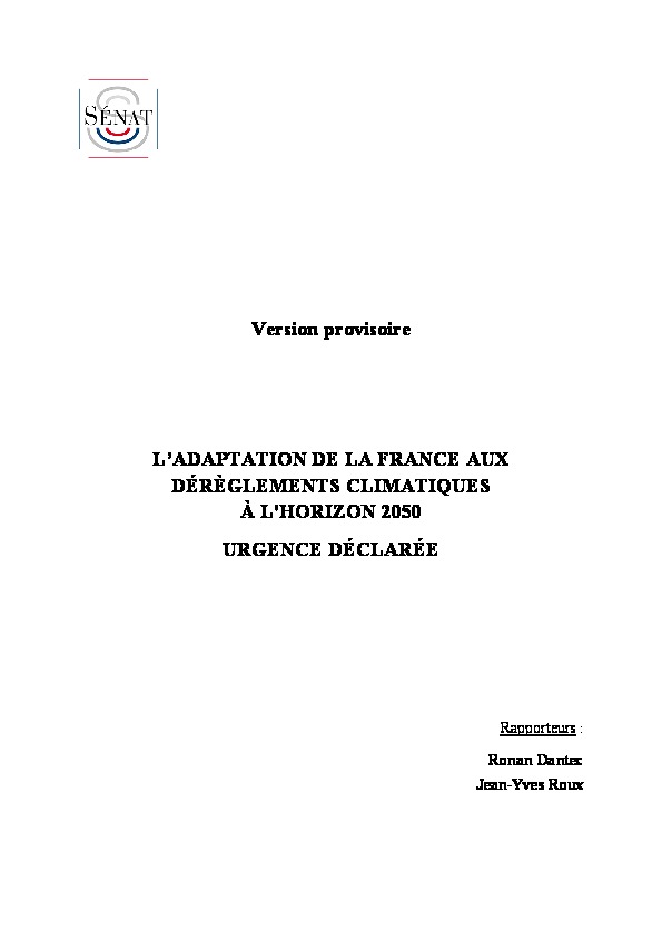 L'adaptation de la France aux dérèglements climatiques à l'horizon 2050 - Urgence déclarée. - (Version provisoire)