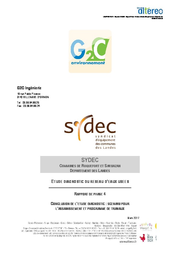 Communes de Roquefort et Sarbazan - Etude diagnostic du réseau d'eaux usées - Rapport de phase 4 - Conclusion de l'étude diagnostic : scenarii pour l'assainissement et programme de travaux.