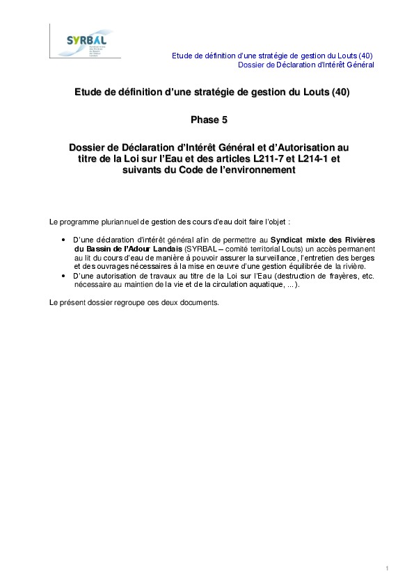 Etude de définition d'une stratégie de gestion du Louts (40) - Phase 5 - Dossier de DIG et d'Autorisation au titre de la Loi sur l'Eau.