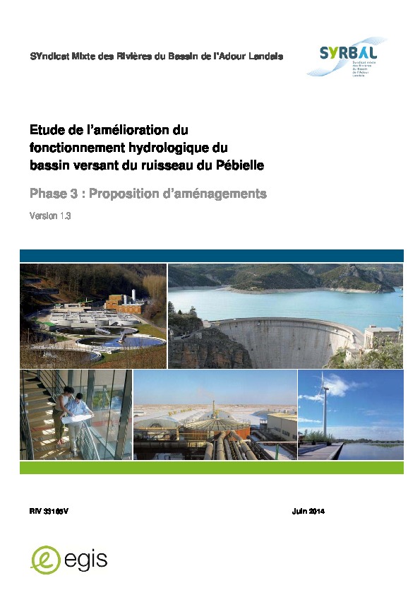 L'étude porte sur le fonctionnement hydrologique du bassin versant du Pébielle dans le but de proposer des aménagements en réponse au risque d’inondation sur la commune d'Eyre-Moncube. Les 3 phases portent sur l'état des lieux (phase1), le diagnostic (phase2) et les propositions d'aménagement (phase3). Les aménagement proposés portent sur : - les aménagements hydrauliques envisageables sur le Pébielle ; - les aménagements agro-environnementaux adaptés au bassin versant ; - des pistes d’aménagement liées au Gabas ; - des préconisations d’entretien et de contrôle.