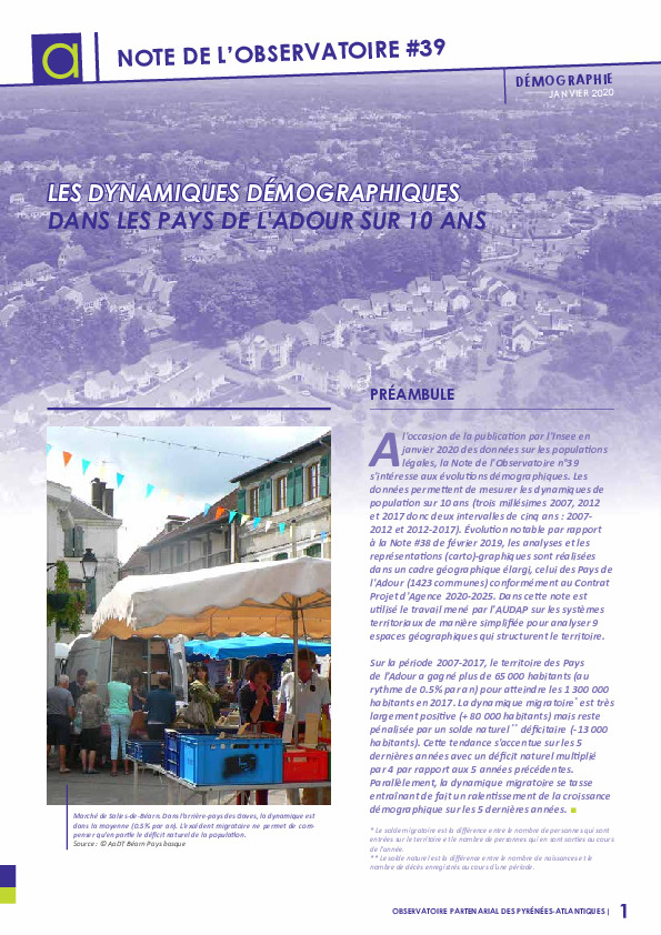 Les données permettent de mesurer les dynamiques de population sur 10 ans (2007-2017), dans le cadre géographique élargi des Pays de l'Adour (1423 communes) conformément au Contrat Projet d'Agence 2020-2025. Sur la période 2007-2017, le territoire des Pays de l’Adour a gagné plus de 65 000 habitants (au rythme de 0.5% par an) pour atteindre les 1 300 000 habitants en 2017. La dynamique migratoire* est très largement positive (+ 80 000 habitants) mais reste pénalisée par un solde naturel ** déficitaire (- 13 000 habitants). La tendance s'accentue ces 5 dernières années.