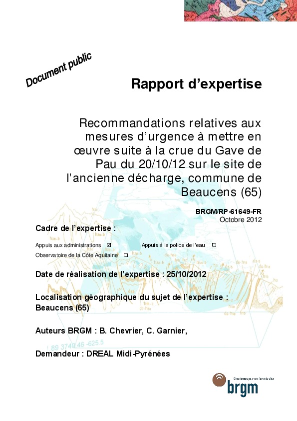 Recommandations relatives aux mesures d'urgence à mettre en oeuvre suite à la crue du Gave de Pau du 20/10/12 sur le site de l'ancienne décharge, commune de Beaucens (65)