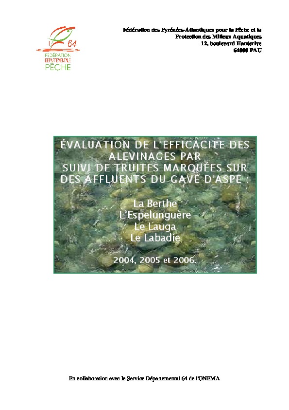 Evaluation de l'efficacité des alevinages par suivi de truites marquées sur les affluents du gave d'Aspe : la Berthe, l'Espelunguère, le Lauga, le Labadie. 2004, 2005 et 2006.