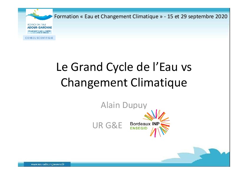 Ce diaporama présenté lors des journées de formation "eau et changement climatique" du 15 au 29 septembre 2020 aborde les mécanismes hydrologiques du changement climatique et les conséquences à l'échelle nationale.