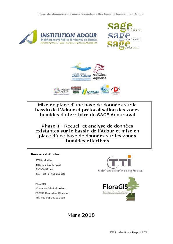 La première partie de cette étude, intitulée "Phase I : Recueil et analyse de données existantes sur le bassin de l’Adour et mise en place d’une base de données sur les zones humides effectives" a pour objectif la mise en place d’une base de données unique et commune à tout le bassin de l’Adour des zones humides effectives (ZHE) élaborée à partir de l’expertise des données issues du territoire de l’Institution Adour. La base de données permettra de renseigner les zones humides suivies (ZHS), probables (ZHP) ou effectives (ZHE) identifiées dans de multiples documents. Elle doit porter sur les périmètres de l'ensemble des SAGE. La phase II de ce travail, "Prélocalisation des zones humides du territoire du SAGE Adour aval" vise à disposer d’une connaissance homogène des zones humides probables en identifiant les enveloppes de forte probabilité de présence de ces zones humides, sur la base de méthodes de photo-interprétation. Elle définit également une base de données alimentée par les zones humides effectives (ZHE) identifiées sur l'ensemble du bassin de l'Adour