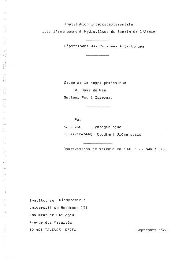 Etude de la nappe phréatique du GAVE DE PAU. Secteur de PAU à COARRAZE.