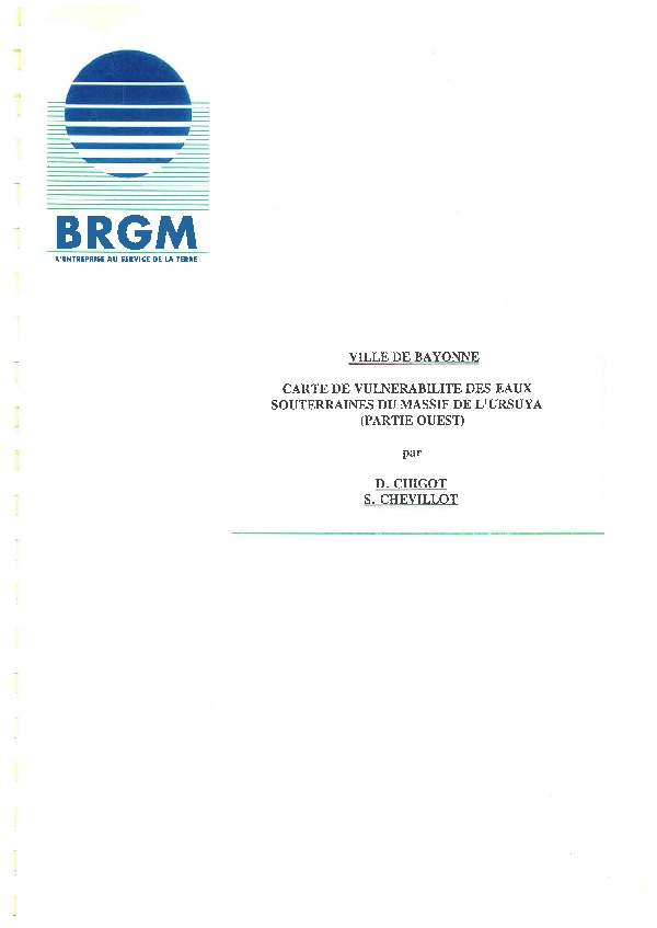 L'étude de vulnérabilité concerne la partie ouest du massif de l'Ursuya où la ville de Bayonne exploite 109 sources d'eau potable. L'ensemble du secteur a été visité, chaque point de pollution potentielle repertoriée. Une étude d'environnement détaillée concerne chaque source. La synthèse des résultats a conduit à l'établissement d'une carte de vulnérabilité au 1/10 000 permettant de préciser les futurs périmètres de protection et les mesures de protection. Le contexte géologique particulier du Massif de l'Ursuya permet d'espérer obtenir des débits intéressants et de l'eau de bonne qualité par la recherche de zones aquifères fissurées par forage. Cette démarche réduirait considérablement le nombre de points d'eau à protéger.