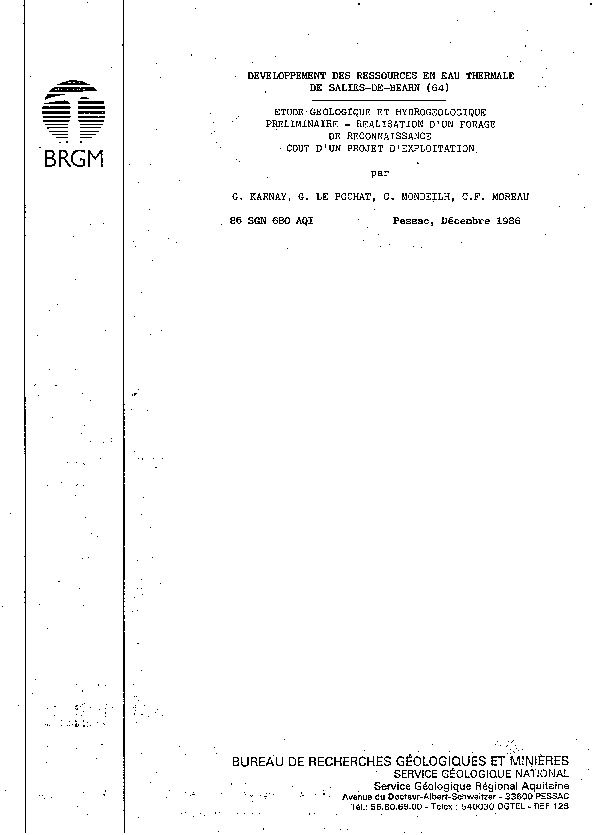 Développement des ressources en eau thermale de SALIES-DE-BEARN (64). Etude géologique et hydrogéologique préliminaires - Réalisation d'un forage de reconnaissance et coût d'un projet d'exploitation.