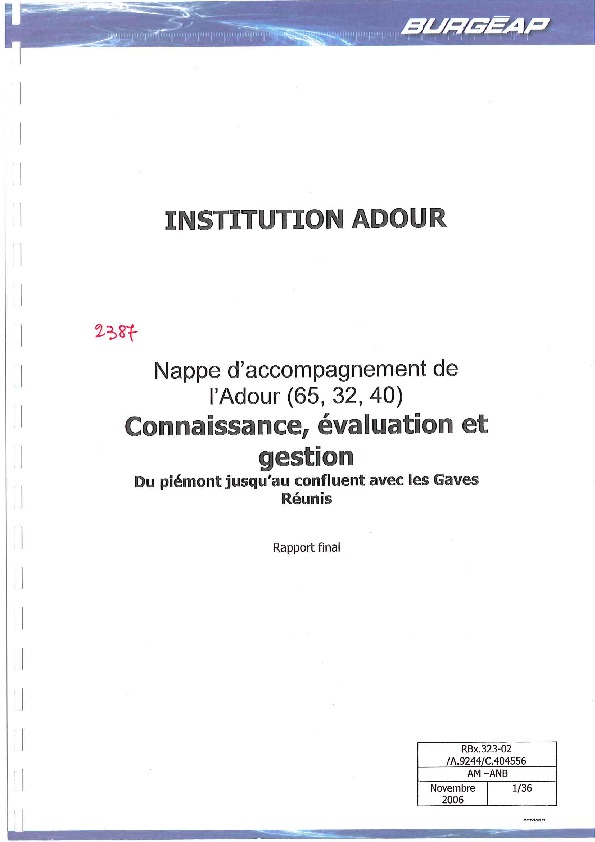 Nappe d'accompagnement de l'Adour. Connaissance, évaluation et gestion. Du piémont jusqu'au confluent avec les Gaves réunis. Rapport final.