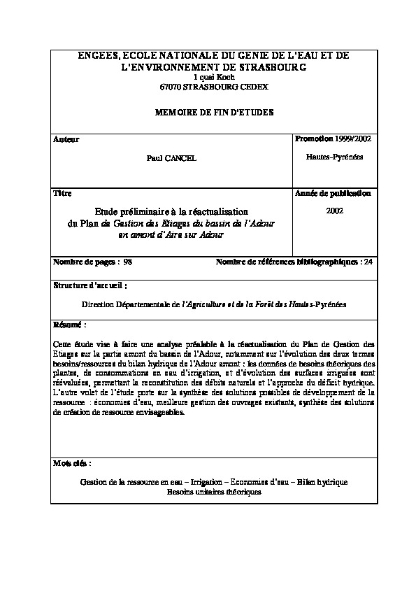 Etude préliminaire à la réactualisation du Plan de Gestion des Etiages du Bassin de l'Adour en amont d'Aire-sur-Adour.