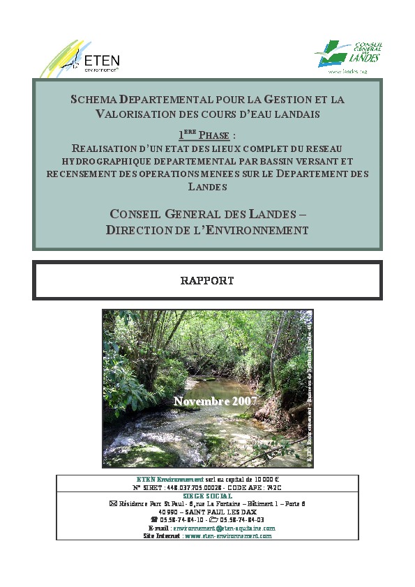 Schéma départemental pour la gestion et la valorisation des cours d'eau landais. 1ère phase : état des lieux. Rapport.