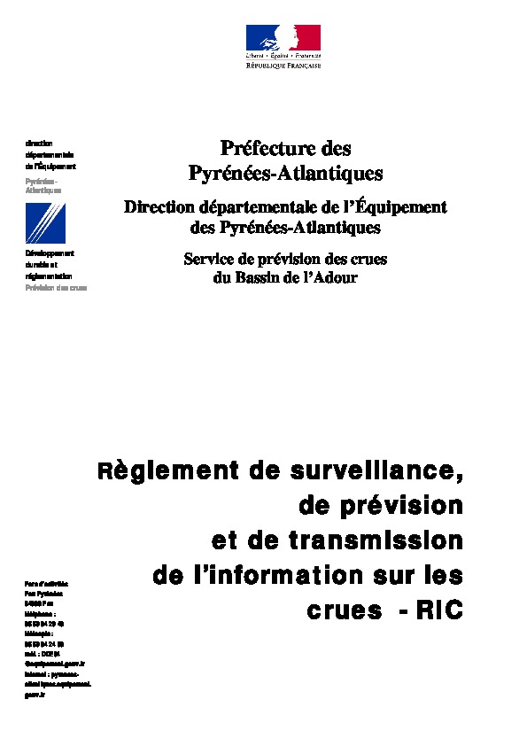 Service de prévision des crues du bassin de l'Adour. Règlement de surveillance, de prévision et de transmission de l'information sur les crues (RIC).