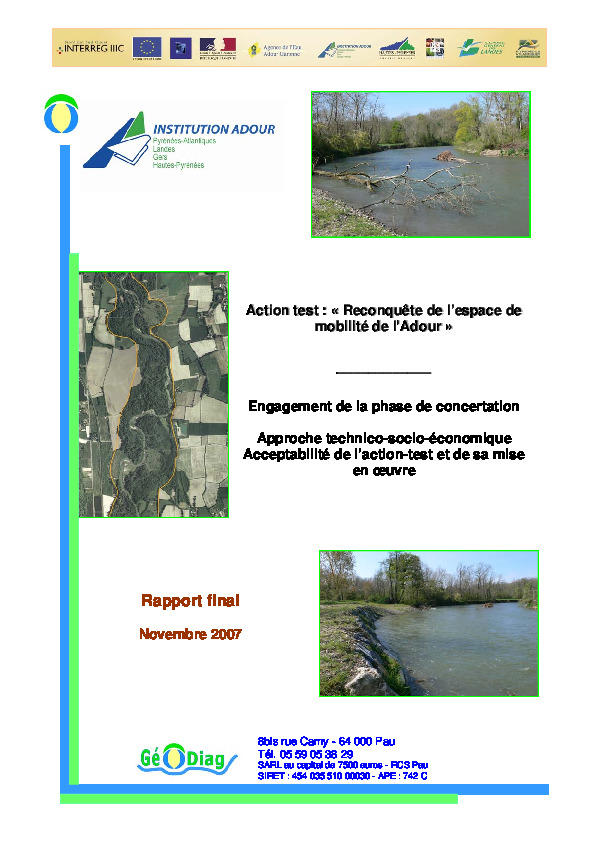 Action test : "Reconquête de l'espace de mobilité de l'Adour". Engagement de la phase de concertation. Approche technico-socio-économique.