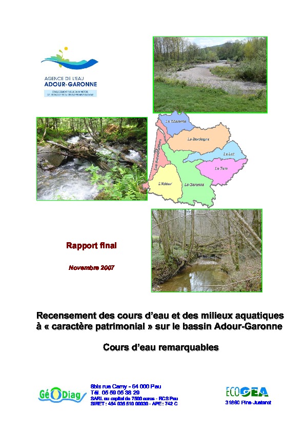 Recensement des cours d'eau et des milieux aquatiques à "caractère patrimonial" sur le bassin Adour-Garonne. Cours d'eau remarquables.