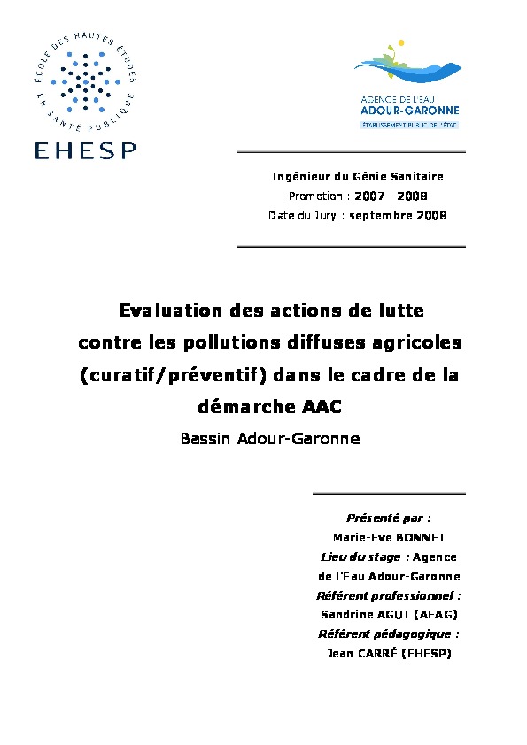Evaluation des actions de lutte contre les pollutions diffuses agricoles (curatif/préventif) dans le cadre de la démarche AAC. Rapport de stage AEAG.