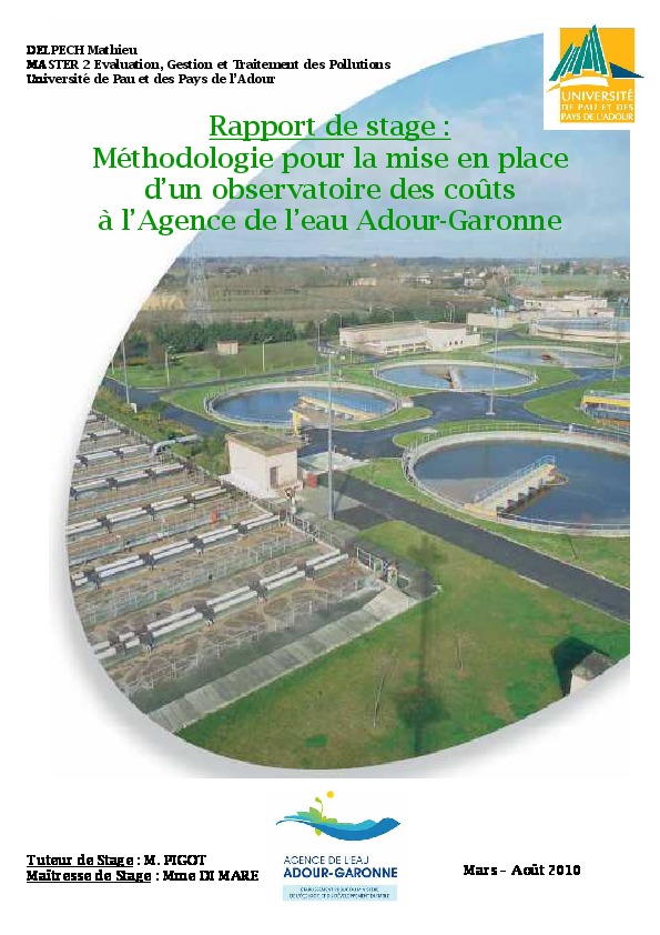 La mise en place d'un observatoire des coûts par les Agences de l'Eau a été demandé par le Ministère de l'Ecologie (circulaire 2007). Le département des collectivités territoriales de l'Agence de l'Eau Adour-Garonne a engagé une première réflexion à partir de l'exemple des stations d'épuration. Le rapport de stage indique le contexte et les objectifs de l'observatoire des coûts et identifie les variables influençant les coûts. M2 EGTP : Evaluation, gestion, traitement des pollutions.