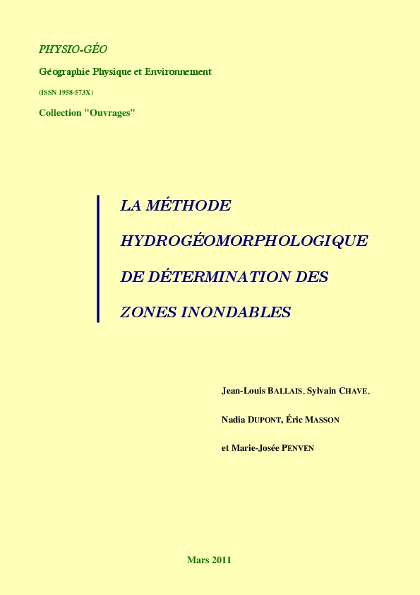 La méthode hydrogéomorphologique est basée sur une démarche naturaliste qui met en évidence les différents lits des cours d'eau, les aménagements susceptibles de perturber les écoulements, en les accélérant ou en les ralentissant et à en déduire les zones inondables, les hauteurs d'eau et la vitesse d'écoulement. Elle s'appuie sur la photo-interprétation et sur une étude terrain. Cette méthode n'est pas exclusive et ne se substitue pas aux méthodes hydrologique et hydraulique. Elle est souvent un préalable nécessaire dans les zones d'incertitude et de forte pression urbaine. L'ouvrage précise les principes de la méthode et de ses applications, en particulier à la cartographie des zones inondables.
