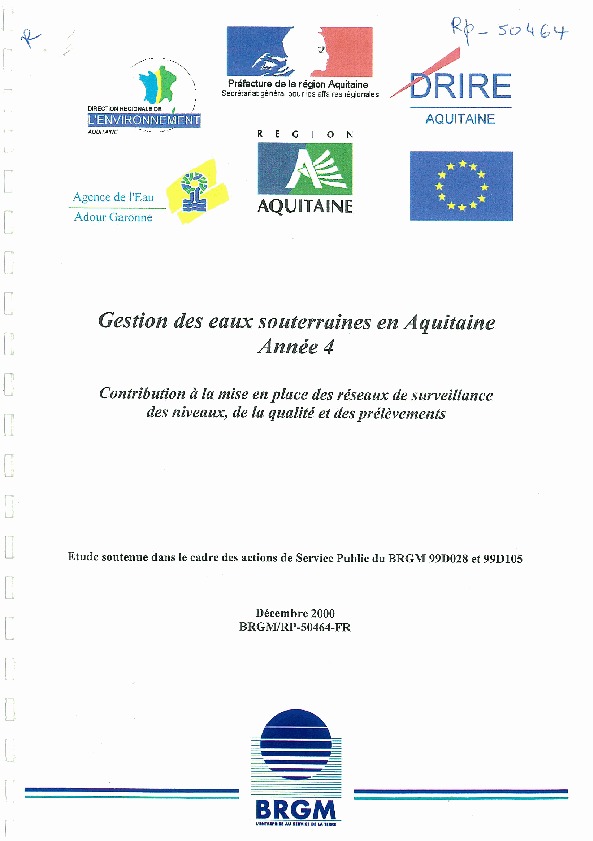 Gestion des eaux souterraines en Aquitaine. Contribution à la mise en place des réseaux de surveillance des niveaux, de la qualité et des prélèvements.