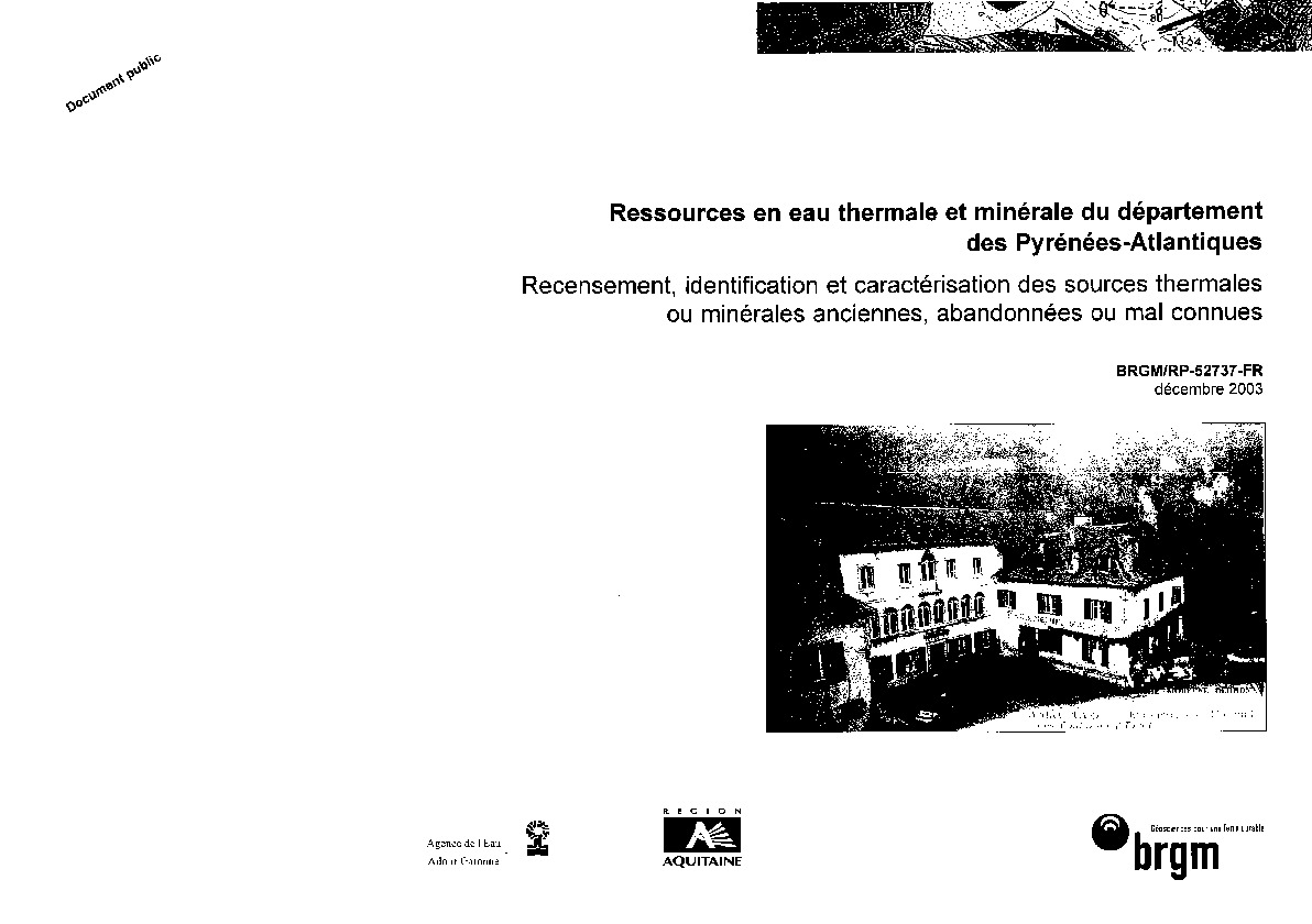 Le thermalisme en Aquitaine représente un enjeu économique important. Depuis 1999 des travaux sur le thermalisme du Bas-Adour et sur cinq grandes stations thermales et la station d'embouteillage d'Ogeu ont été menés et ont fait l'objet de synthèse par station. Dans une seconde phase, un étude de détail des sources thermales et/ou minérales anciennes, abandonnées ou mal connues est menée. Une quarantaine de sources ont été identifiées. Des fiches, illustrées de photos, présentent les sources : nom, localisation, propriété, historique, bibliographie, régime, caractéristiques physiques, chimiques et biologiques, morphologie et aménagement de la zone d'émergence.