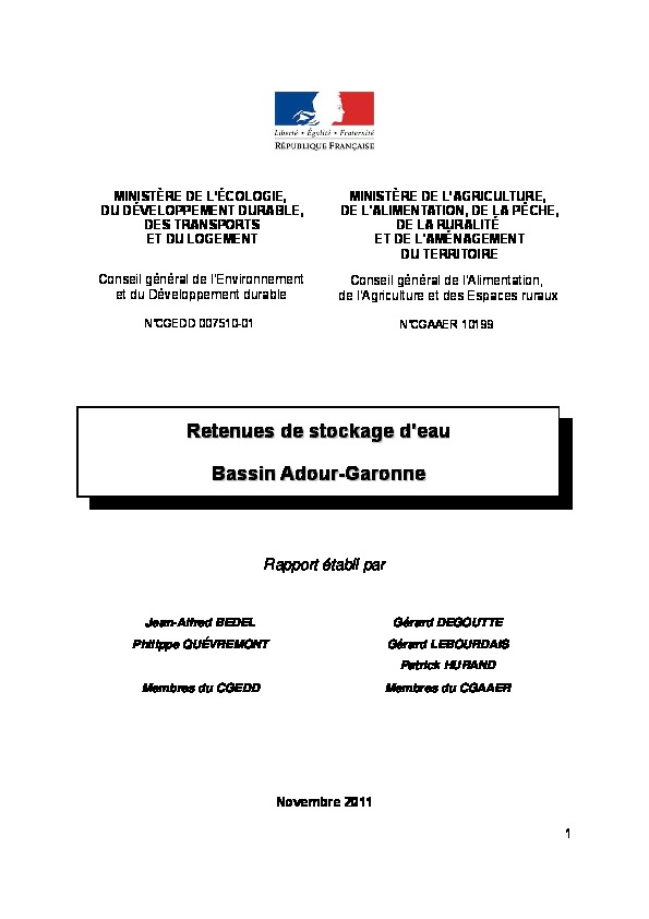 Les projets de retenues d'irrigation "envisageables d'un point de vue environnemental et économique" sur 11 sous bassins d'Adour Garonne dont celui de l'Adour sont identifiés. La concept est définit. En ce qui concerne l'Adour, la mission a examiné 9 projets identifiés sur l'Adour amont pour résorber le déficit de 10 hm3/an constaté en amont d'Aire. La recevabilité environnementale et économique de chaque projet est analysée. La mission recommande de : mettre en oeuvre la solution Ousse/Louet 2/Barne en commençant par le barrage de l'Ousse ; de prévoir un renforcement du transfert Adour vers l'Echez en augmentant la capacité de transit du canal de la Gespe ou en créant une seconde liaision (probablement par conduite) ; de supprimer l'impact thermique sur l'Adour des anciennes gravières de Bours-Bazet.L'analyse économique conclut à des coûts disproportionnés des retenues de substitution.