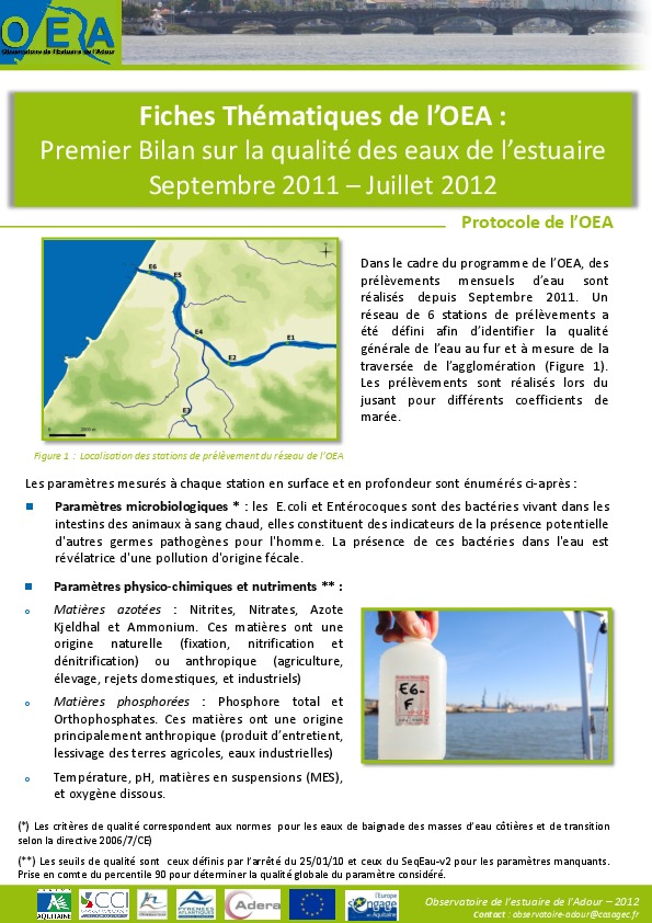 Dans le cadre du programme de l'Observatoire de l'Estuaire de l'Adour, des prélèvements mensuels d'eau sont réalisés depuis 2011 sur 6 points répartis sur l'estuaire. Un premier bilan de la qualité des eaux est établi sur la période septembre 2011- juillet 2012.