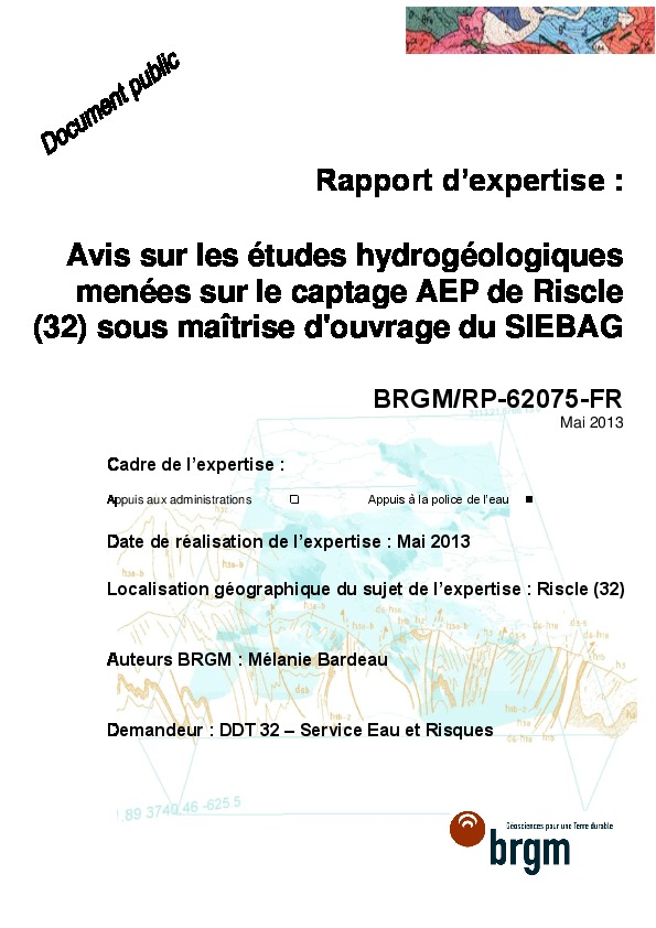 Rapport d'expertise. Avis sur les études hydrogéologiques menées sur le captage AEP de Riscle sous maîtrise d'ouvrage du SIEBAG.