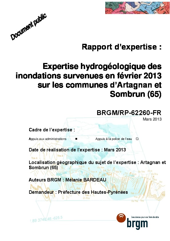 Expertise hydrogéologique des inondations survenues en Février 2013 sur les communes d'Artagnan et Sombrun (65). Rapport d'expertise.