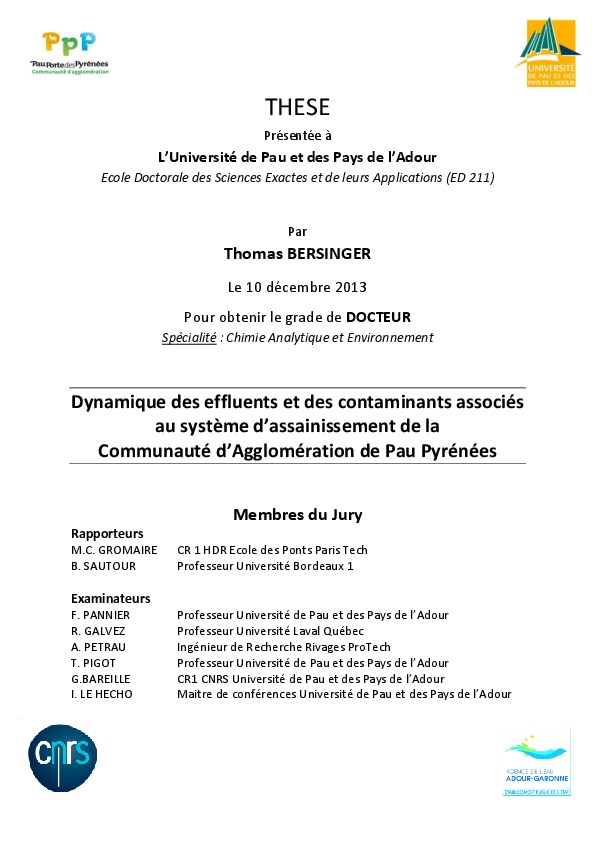 Dynamique des effluents et des contaminants associés au système d'assainissement de la Communauté d'Agglomération Pau-Pyrénées.