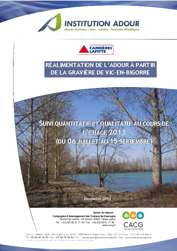 Réalimentation de l'Adour à partir de la gravière de VIC-EN-BIGORRE. Suivi quantitatif et qualitatif au cours de l'étiage 2013 (du 6 juillet au 13 septembre.