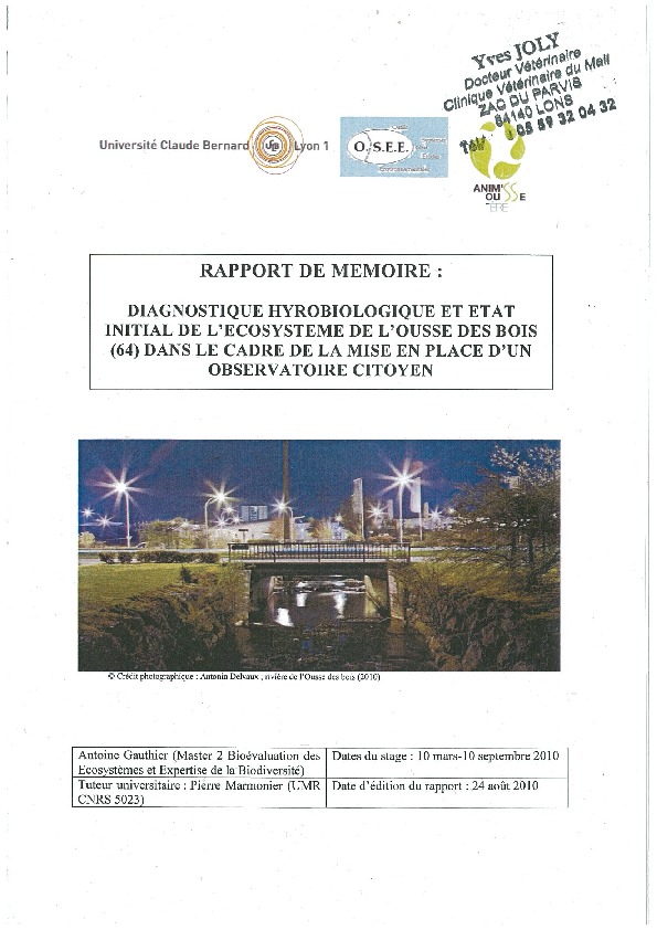 Diagnostic hydrobiologique et état initial de l'écosystème de l'Ousse des Bois (64) dans le cadre de la mise en place d'un observatoire citoyen.