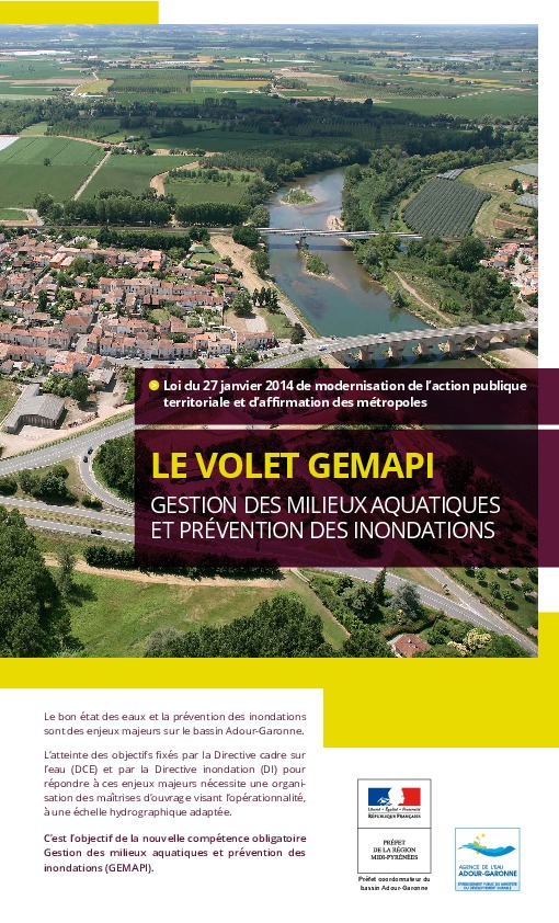 Cette plaquette sur la compétence GEMAPI met en avant le rôle des élus et la nécessaire cohérence des politiques publiques, et énumère les principes : - mettre en place des collectivités dotées de moyens techniques et financiers adaptés et assurant la prévention des inondations ainsi que la gestion des rivières et milieux aquatiques; - nétablir une gouvernance sur 3 niveaux : bloc communal, EPAGE, EPCI. On constate déja une mobilisation des acteurs locaux, en terme de regroupement de maitrise d'ouvrage, et de mise en oeuvre de Plans Pluriannuels de Gestion (PPG). Les principaux partenaires sont cités pour développer cette compétence en Adour-Garonne.