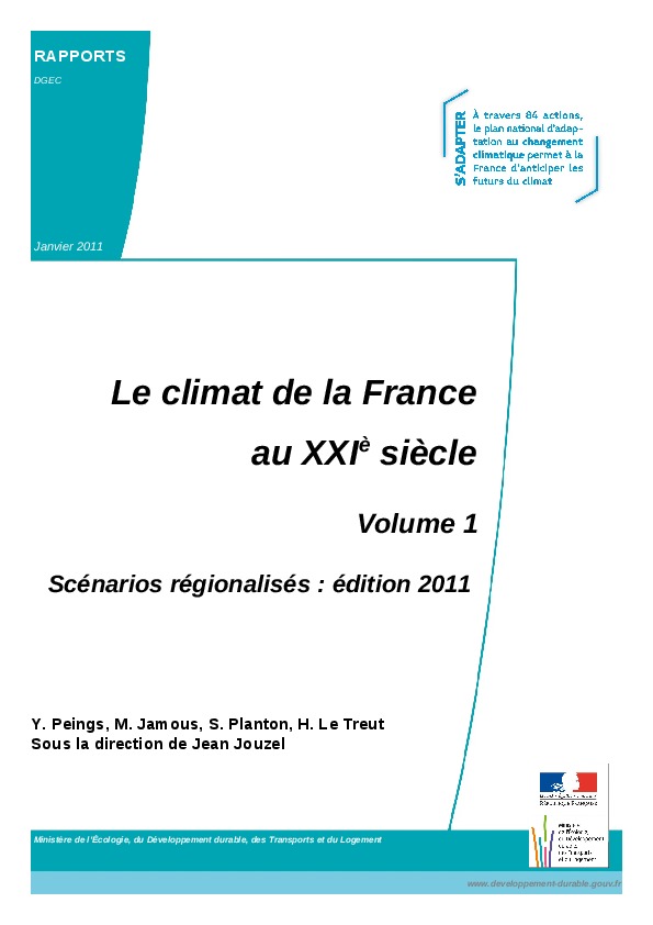 Le rapport présente les scénarios climatiques pour la France dans le cadre du premier Plan national d'adaptation. Il aborde un scénario optimiste (B2) et des scénarios plutôt pessimistes (A2). Les résultats sont présentés sous forme de tableaux, figures et cartes, et portent sur des moyennes et extrêmes limatiques (températures, précipitation, humidité, vents)
