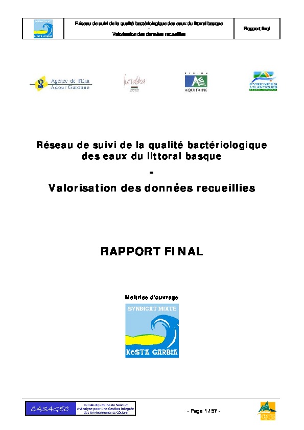 Réseau de suivi de la qualité bactériologique des eaux du littoral basque. Valorisation des données recueillies. Rapport final.