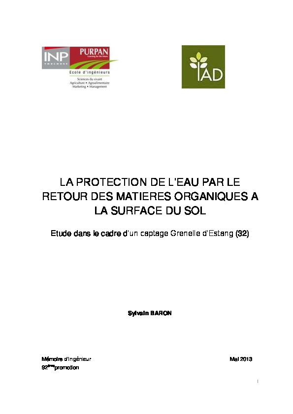 La protection de l'eau par le retour des matières organiques à la surface du sol. Etude dans le cadre du captage Grenelle d'Estang (32).