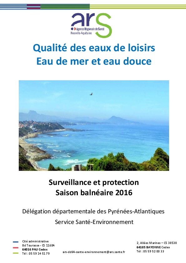 Qualité des eaux de loisirs. Eau de mer et eau douce. Surveillance et protection. Saison 2016.