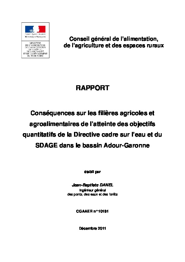 Conséquences sur les filières agricoles et agroalimentaires de l'atteinte des objectifs quantitatifs de la Directive cadre sur l'eau et du SDAGE dans le bassin Adour-Garonne.