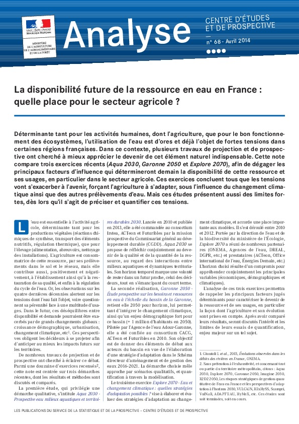 Déterminante tant pour les activités humaines, dont l'agriculture, que pour le bon fonctionnement des écosystèmes, l'utilisation de l'eau est d'ores et déjà l'objet de fortes tensions dans certaines régions françaises. Dans ce contexte, plusieurs travaux de projection et de prospective ont cherché à mieux apprécier le devenir de cet élément naturel indispensable. Cette note compare trois exercices récents (Aqua 2030, Garonne 2050 et Explore 2070), afin de dégager les principaux facteurs d'influence qui détermineront demain la disponibilité de cette ressource et ses usages, en particulier dans le secteur agricole. Ces exercices concluent tous que les tensions vont s'exacerber à l'avenir, forçant l'agriculture à s'adapter, sous l'influence du changement climatique ainsi que des autres prélèvements d'eau. Mais ces études présentent aussi des limites fortes, dès lors qu'il s'agit de préciser et quantifier ces tensions.