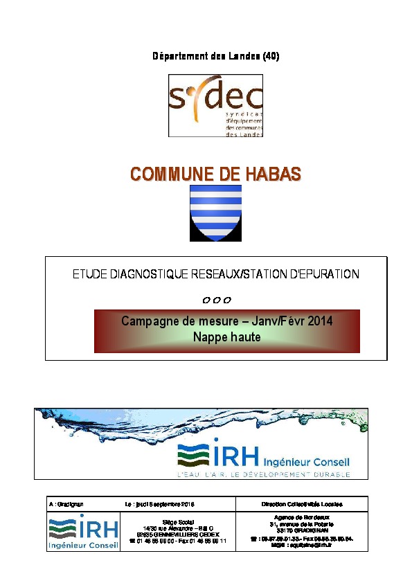 L'étude diagnostique porte sur : · la réalisation d’un diagnostic du fonctionnement du système d'assainissement du bourg de la commune de Habas, · la réalisation d'un schéma directeur d'assainissement.