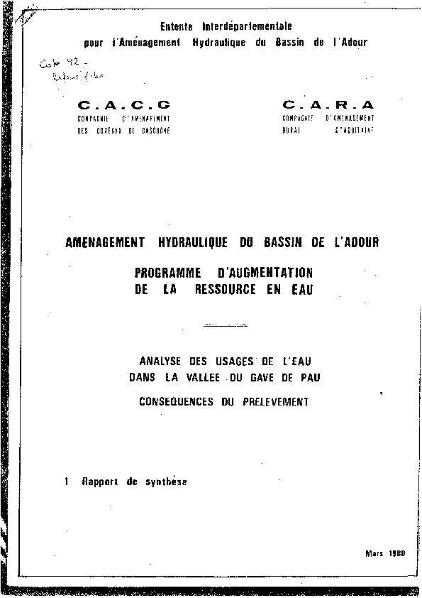Le programme quantité du Schéma d'Aménagement Hydraulique du Bassin de l'Adour (juin 1977) prévoyait un transport de 3 m3/s du Gave de Pau sur l'Adour par l'intermédiaire de l'Echez, pour débloquer la situation critique dans la vallée de l'Adour. Cette étude a pour but de vérifier si ce transport ne porterait pas préjudice aux riverains du Gave de Pau. Elle conclue à la nécessité de création d'une réserve de compensation à long terme pour sauvegarder des intérêts qui ne seraient pas touchés à court terme et moyen terme par le prélèvement. Elle insiste sur la nécessité du maintien du niveau du lit du Gave pour poursuivre l'exploitation de la nappe alluviale très à l'amont de Pau mais menacée par l'exploitation des granulats.
